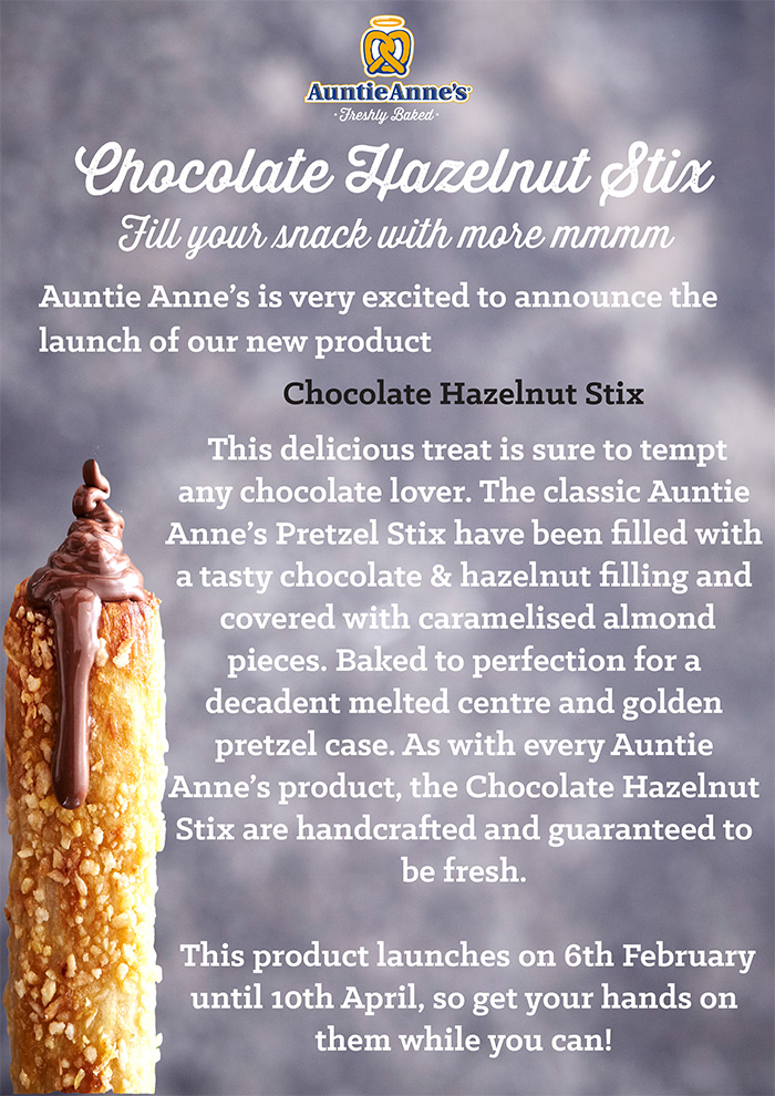 From the 6th February to 10th April, Auntie Anne’s Limited Edition Hazelnut Chocolate Stix will be in Bloomfield Shopping Centre, we can’t wait!