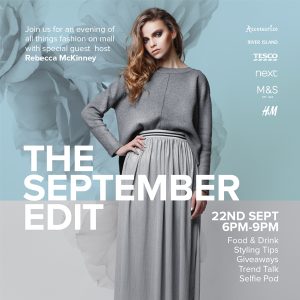 Join us for an evening of fashion, fun and freebies on the 22nd Sept from 6pm – 9pm with special guest host Rebecca McKinney.