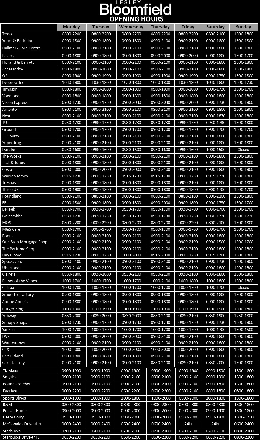 Please scroll for Special Opening Hours